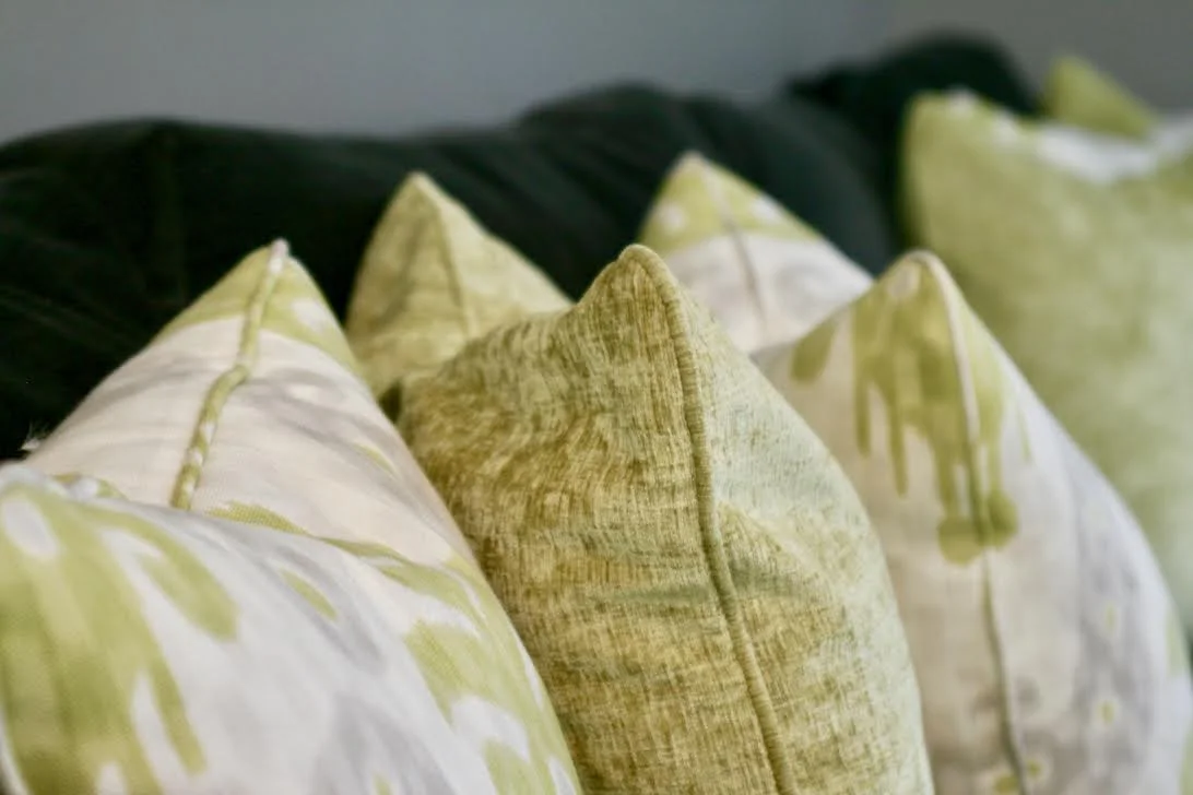The pillows were custom made using a gray/chartreuse Ikat fabric and chartreuse chenille.