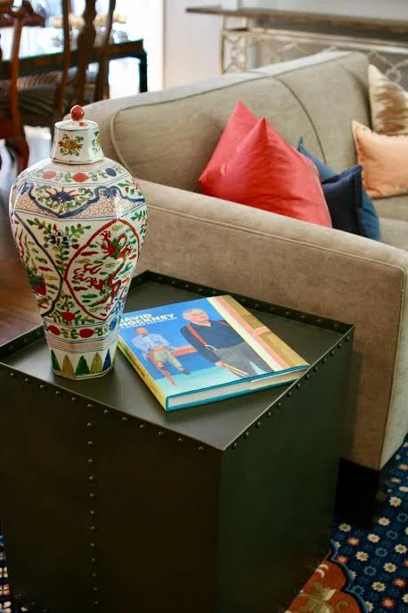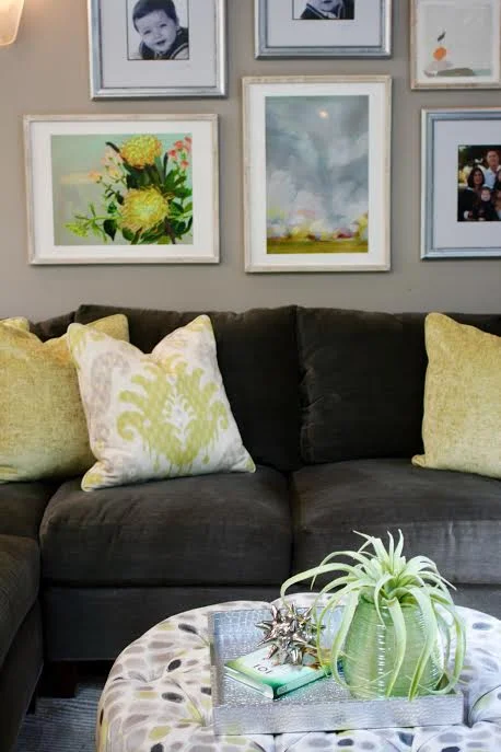 When redesigning their space, I chose a custom sectional from Century Furniture in a luxe gray velvet that wears well and won't show stains. The sectional has a chaise on one side and extra seating on the other. Perfect for those who want to lie down while providing seating for the rest of the family. We had an ottoman custom made, using a fun gray and chartreuse polka dot fabric.