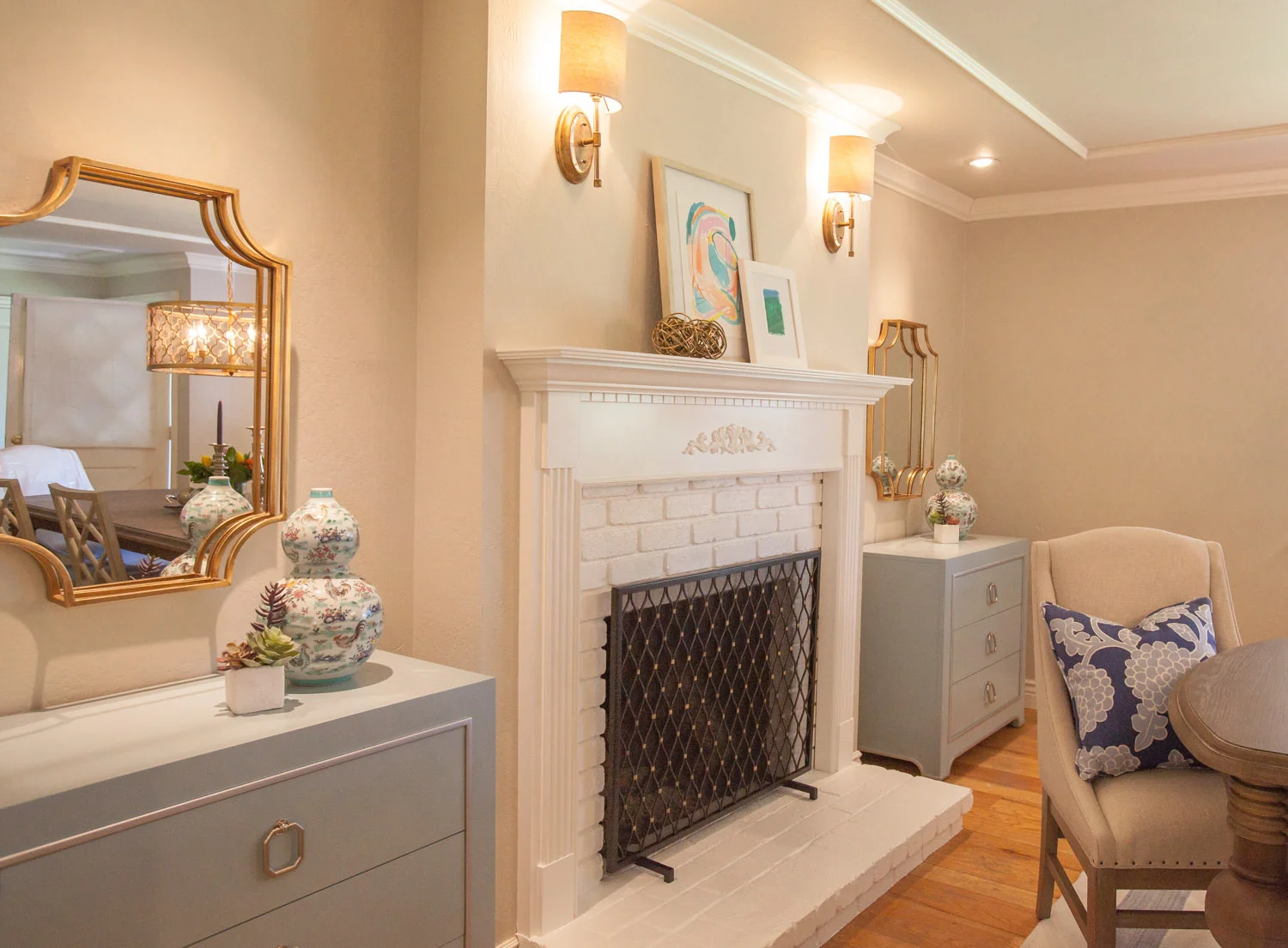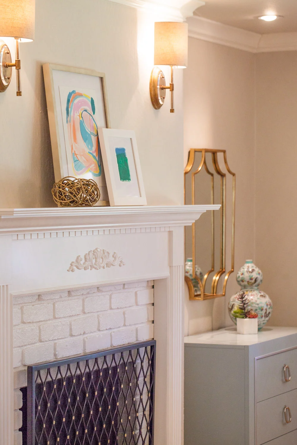We changed out the sconces, painted the brick and added a new fireplace screen which updated the look without breaking the bank.