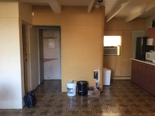 I removed all of the cabinetry on the right (I'll post that next!), painted and changed the flooring (see previous blog post here) -- added a drapery panel to the doorway on the left, to hide a storage bookcase and mini-fridge (so glad I have a fridge to house my personal stash of Girl Scout cookies!!)